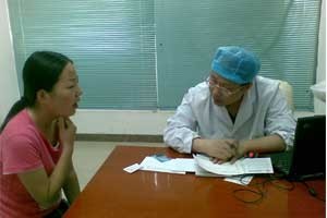 图为:患者来医院向医生咨询喉咙肿痛的问题