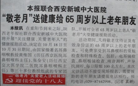 在重阳节来到之际,陕西老年报社联合县新城重大医院将开展“关注健康,关爱老年人”的健康援助活动。决定在10月18日至10月31日期间,由级著名耳鼻喉教授(历任耳鼻咽喉科主任)、张全安(历任西安医学院二医院耳鼻咽喉科主任)等三十多位教授组成的医生团队,开展对全省65周岁以上老人“敬老月”大型健康援助活动。