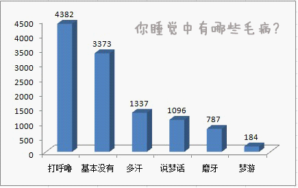 图表解析:在8979位参与调查者中,睡觉打鼾基本占到一半,另外晚上出汗、说梦话也是比较常见的毛病。