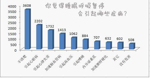 图表解析:调查中将近一半网友不太清楚睡眠呼吸暂停会引起哪些疾病,另外还有部分网友认为没有危害。但更多的网友认为其会引起心脏问题。