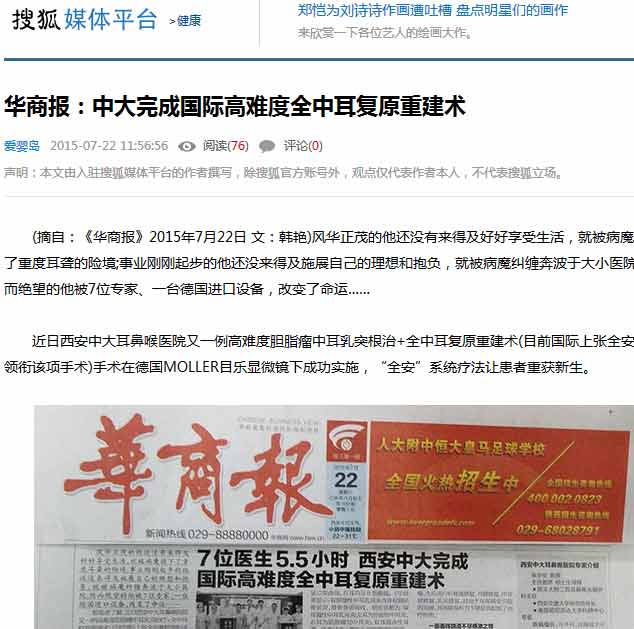 (摘自:《华商报》2015年7月22日 文:韩艳)风华正茂的他还没有来得及好好享受生活,就被病魔推下了重度耳聋的险境;事业刚刚起步的他还没来得及施展自己的理想和抱负,就被病魔纠缠奔波于大小医院;然而绝望的他被7位医生、一台  进口设备,改变了命运……