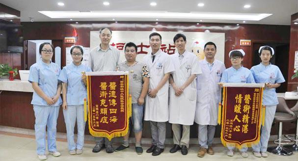 樊先生出院时检查显示:左外耳道无充血肿胀,无异常分泌物。为表示感谢,樊先生特意为中大张全安教授和医护人员送来锦旗:“医德传四海,医术克顽症”“医术精湛,情暖人心”。临走前他紧紧地握住张教授的手:“感谢您治好了我的耳朵愿您身体安康!”