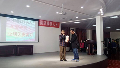 活动现场,肢协副主席严育斌、盲人协会主席魏国光、精残协会主席文萍、聋人协会主席贾双登、智障协会主席杨琪依次发表了讲话,向残疾人朋友传递关怀和鼓励。西安中大耳鼻喉医院院长送上祝福,预祝活动成功,并赠送了鼻子宝宝公仔礼品。